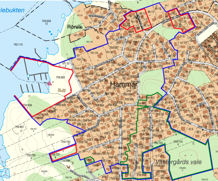 Vårt område börjar vid Haraldsons väg 6 och omfattar därifrån hela Hammar. Haraldsons väg är den enda körvägen till området. Således avgränsas området vid de fyra gångvägarna ut ur det. Ett par undantag finns som gäller för Gertruds gata och Dalstigen där ett antal fastigheter i slutet av gatorna endast är anslutna till föreningens dagvattennät, samt Barriärvägen vars dagvatten är undantaget.
